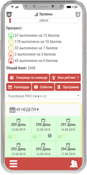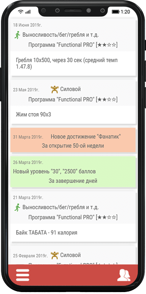 Вы можете видеть присвоение новых уровней Вам, как атлету, улучшение прогресса при прохождении программ, а также знать всё это в правильной хронологии, даже если Вы одновременно проходите несколько тренировочных программ.